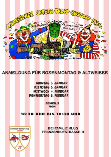 Aus versicherungstechnischen Gründen ist es unbedingt erforderlich, dass alle Fuß – und Wagengruppen, die am Rosenmontagsumzug teilnehmen, gemeldet sind. Wir erheben daher pro Zugteilnehmer eine Versicherungsgebühr von 5,00€. Kinder bis 14 Jahren müssen gemeldet werden,[…]