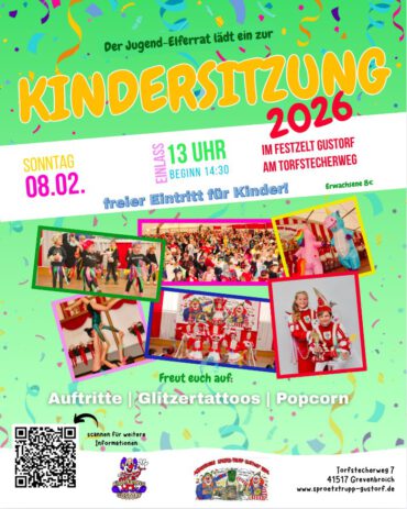 Kindersitzung am 08.02.2026 Der Jugend-Elferrat lädt ein zur Kindersitzung 2026. Der Einlass beginnt um 13:00 Uhr und Beginn 14:30 Uhr. Freut euch auf viele Auftritte, Glitzertattoos und Popcorn.